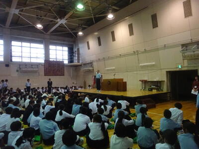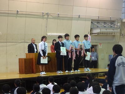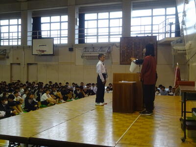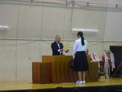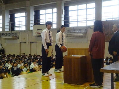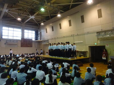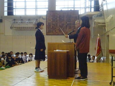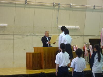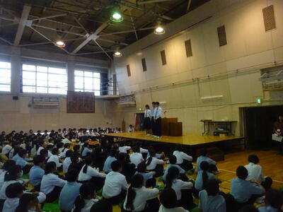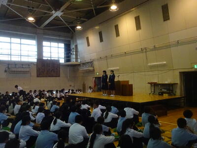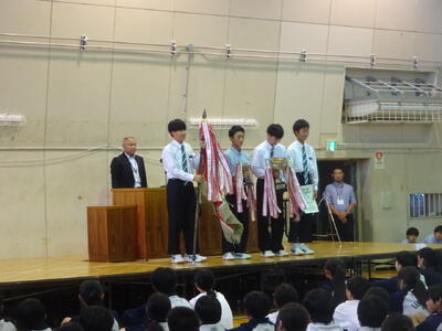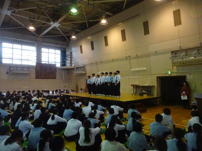 今日の北中(10月15日) 投稿: 川口北中学校 (15:11) 今日は5時間目終了後に体育館で、2学期前半の表彰伝達、県新人戦及び川口市中学校駅伝競走大会の壮行会が行われました。県大会には、野球部、剣道部(女子)、バドミントン部(男子)が出場します。最後に任期を終える現生徒会本部役員からの挨拶がありました。