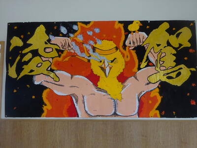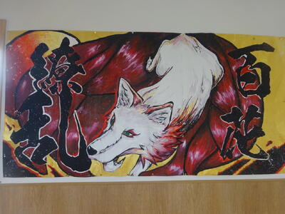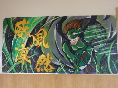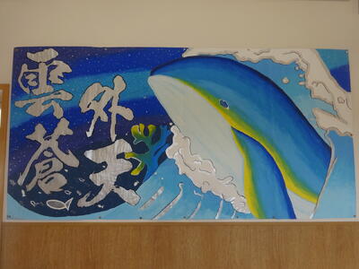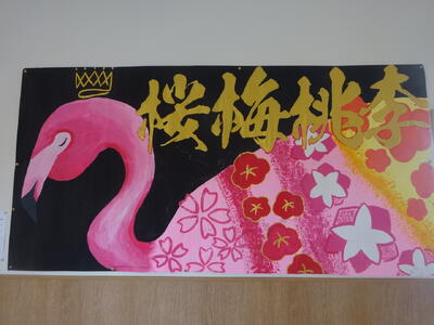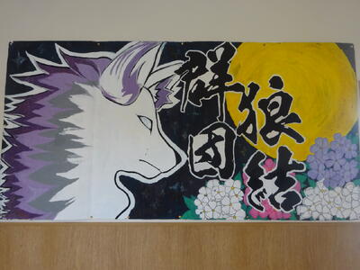管理棟と教室棟の間にある2階の渡り廊下に、10月に行われた体育祭で作成された応援ボードが掲示されました。
