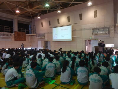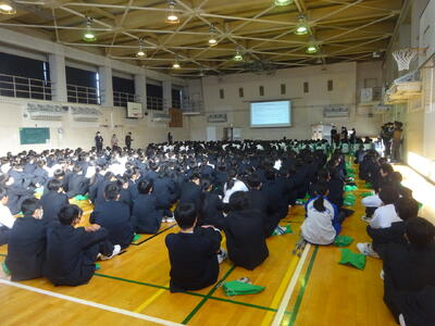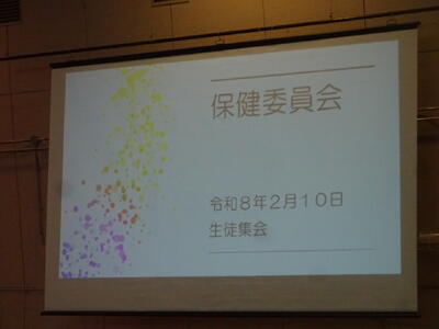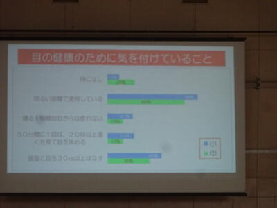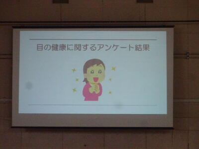 今日は1時間目の前に体育館で生徒集会が開かれました。保健委員会から目の健康に関する内容が発表されました。