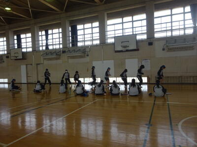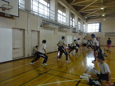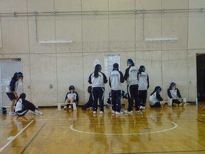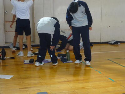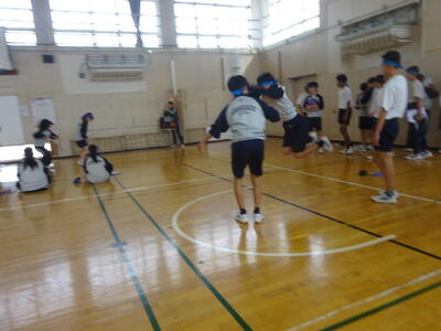 3年生の体育の授業では新体力テスト(握力、立ち幅跳び、反復横跳び、長座体前屈)が行われ、自己記録更新を目指して頑張っていました。