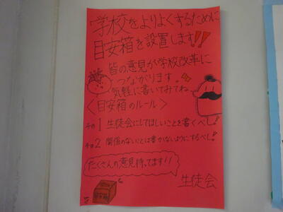 生徒会の取り組みの一環として、目安箱の設置が始まりました。北中をよりよくするためアイデアがたくさん出ることを願っています。