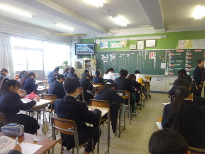 昨日の雪で第2校舎と昇降口の前は雪が残り、一部は滑りやすくなってきたため、カラーコーンで囲みました。5時間目に1年生は講師を招き、「思春期講座」という授業を行いました。